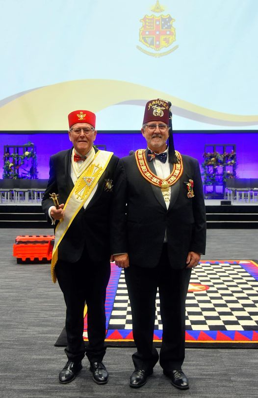 The Deputy from the Province of Victoria of the Ancient and Accepted Scottish Rite (Scottish constitution) V∴Ill∴Bro. Neil Nyholm 33° and the President of Shriners Australia, Noble Terry Webster, representing their respective orders at the 2023 Grand Installation of Freemasons Victoria.